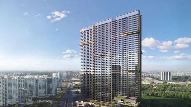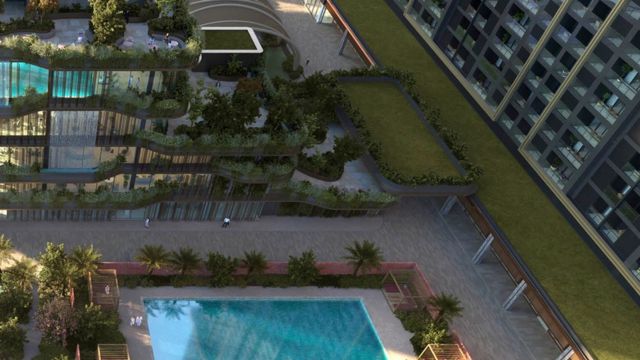 70,000 sq.ft. clubhouse, infinity pool, spa, gym, sports facilities, landscaped gardens, sky bridges, and wellness zones.